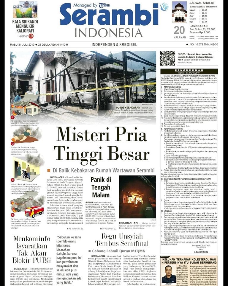 Sebelumnya, Selasa (30/7/2019) malam, rumah Asnawi dibakar orang yang belum diketahui identitasnya. Warga melihat sosok pria tinggi besar sebelum kejadian di dekat rumah itu. Diduga, rumah itu dibakar karena berita yang ditulis wartawan tersebut tentang kasus korupsi di Kuta Cane, Aceh Tenggara.