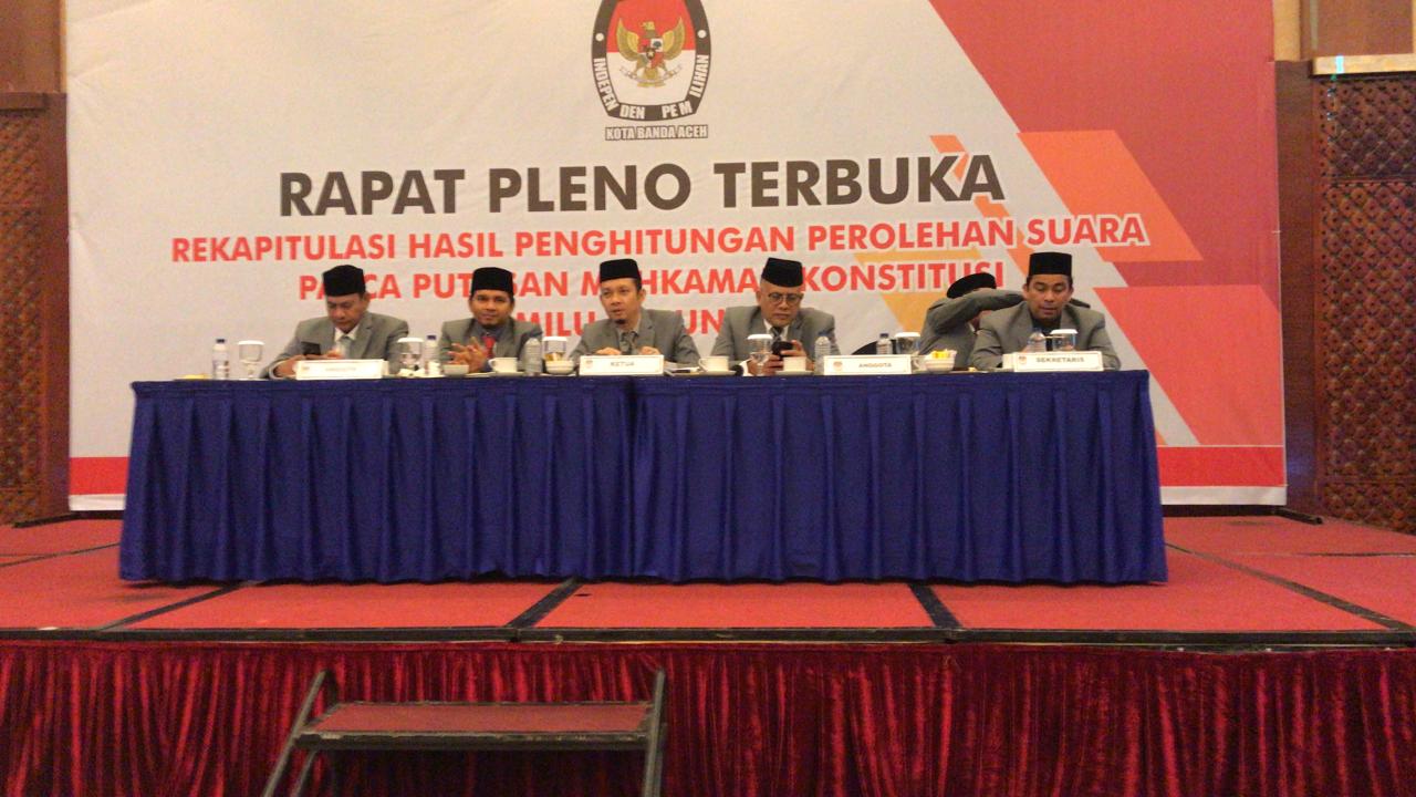 BANDA ACEH |KIP Kota Banda Aceh menggelar rapat pleno terbuka dengan agenda rekapitulasi hasil perhitungan perolehan suara pasca putusan Mahkamah Konstitusi (MK) Pemilu tahun 2019, Selasa (13/8/2019) di Hotel Hermes Palace, Banda Aceh.