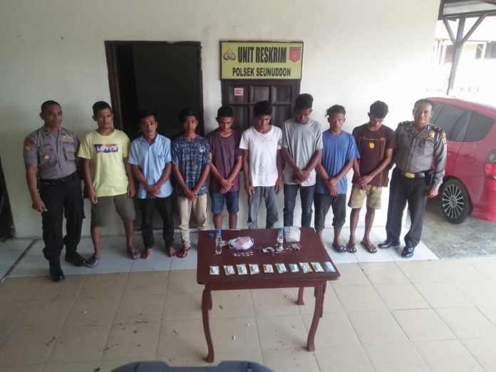 LHOKSUKON | Polsek Seunuddon Kesatuan Polres Aceh Utara mengamankan Delapan pemuda terkait kasus penyalahgunaan Narkoba jenis sabu, mereka ditangkap di tiga lokasi terpisah, Kamis (3/10/2019).