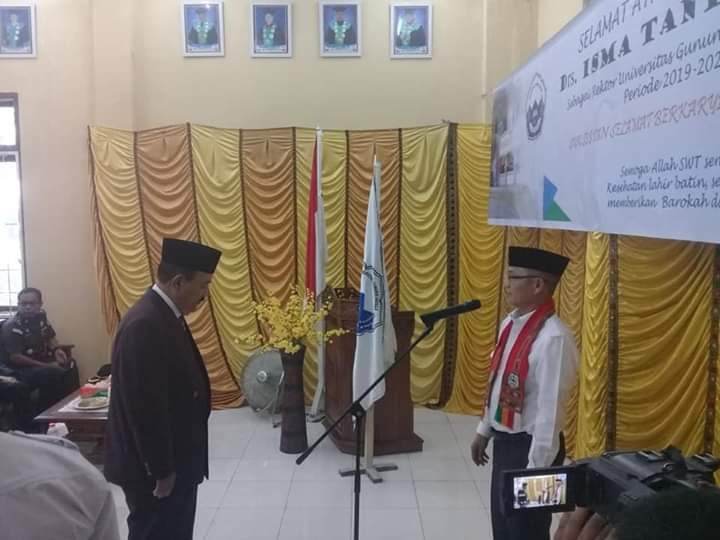 KUTACANE| Wakil Bupati Aceh Tenggara Bukhari Puspa, melantik Isma Tantawi, sebagai Rektor Universitas Gunung Leuser (UGL) Priode 2019-2023 di kampus itu, Rabu (30/10/19).