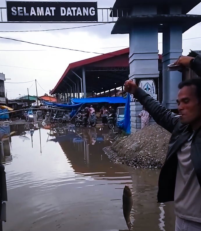 KUTACANE| Seorang tukang becak, Marhamuddin, “memancing” di kubangan jalan masuk pajak pagi Desa Bacang Lade, Kecamatan Lawe Bulan, Kabupaten Aceh Tenggara, Sabtu (1/11/2019).