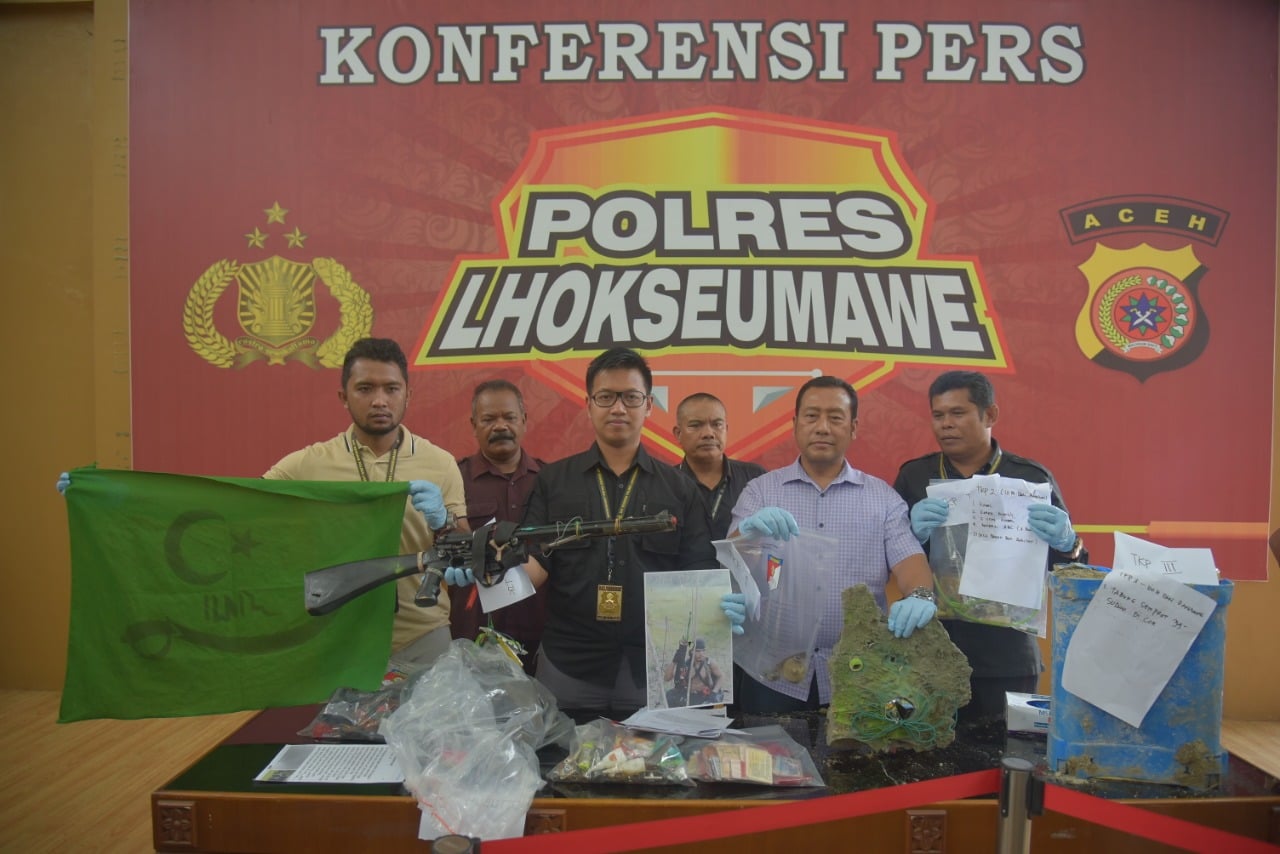 Barang bukti yang disita dari pelaku berupa satu unit senjata api laras panjang rakitan, senjata itu memiliki dua laras sehingga apabila ditembakkan akan keluar dua unit peluru, serta dibadan pelaku ditemukan rompi anti peluru. Granat nanas dan bahan peledak yang telah dimusnahkan di markas Brimob Jeulikat, Lhokseumawe.