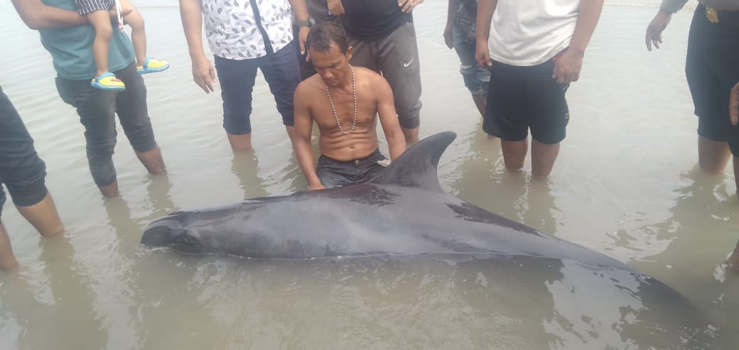 ACEH TIMUR– Nelayan menemukan paus sepanjang dua meter di Pantai Gampong Leuge, Kecamatan Peureulak, Kabupaten Aceh Timur, Senin (3/2/2020).