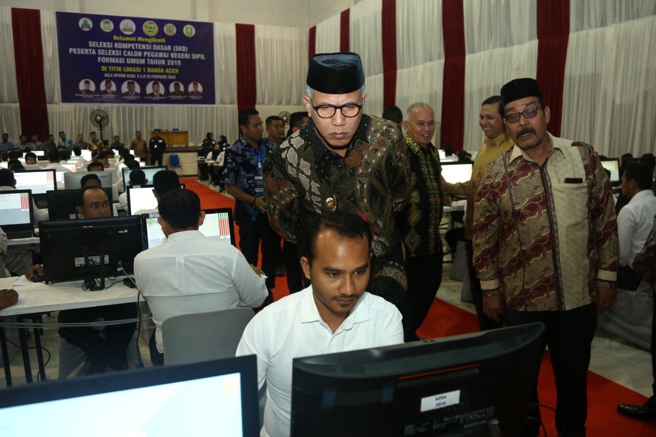 Banda Aceh – Pelaksana Tugas Gubernur Aceh, Nova Iriansyah, didampingi Sekda Aceh Taqwallah, meninjau pelaksanaan Seleksi Kompetensi Dasar (SKD) CPNS Pemerintah Aceh Formasi Tahun 2019, di Titik Lokasi I Aula Badan Pengembangan Sumber Daya Manusia (BPSDM) Aceh, Kamis (6/2/2020). Tes tersebut, akan dilaksanakan pada 6-20 Februari 2020.