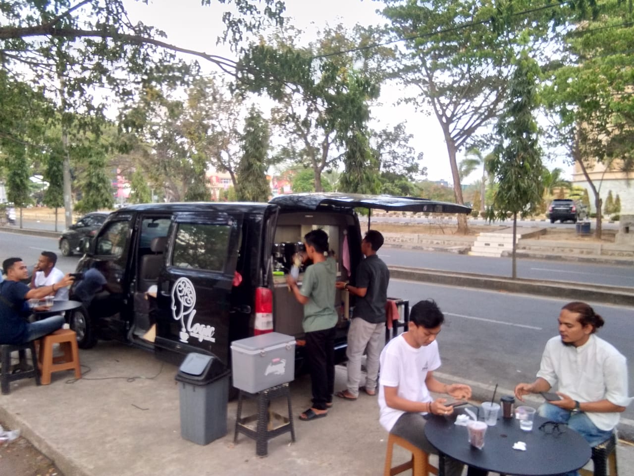 Dua meja diletakan di samping mobil untuk tempat minum kopi. Biasanya, warung mobil itu kerap melayani pembeli dan minum di situ. Kini, hanya sebagian warga memesan kopi dengan sistem beli dan bungkus.