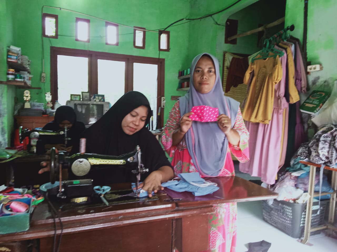 Dalam sehari dia bisa memproduksi enam lusin masker kain aneka warna. Bahkan, sepekan terakhir enam pekerja membantu memproduksi masker itu.