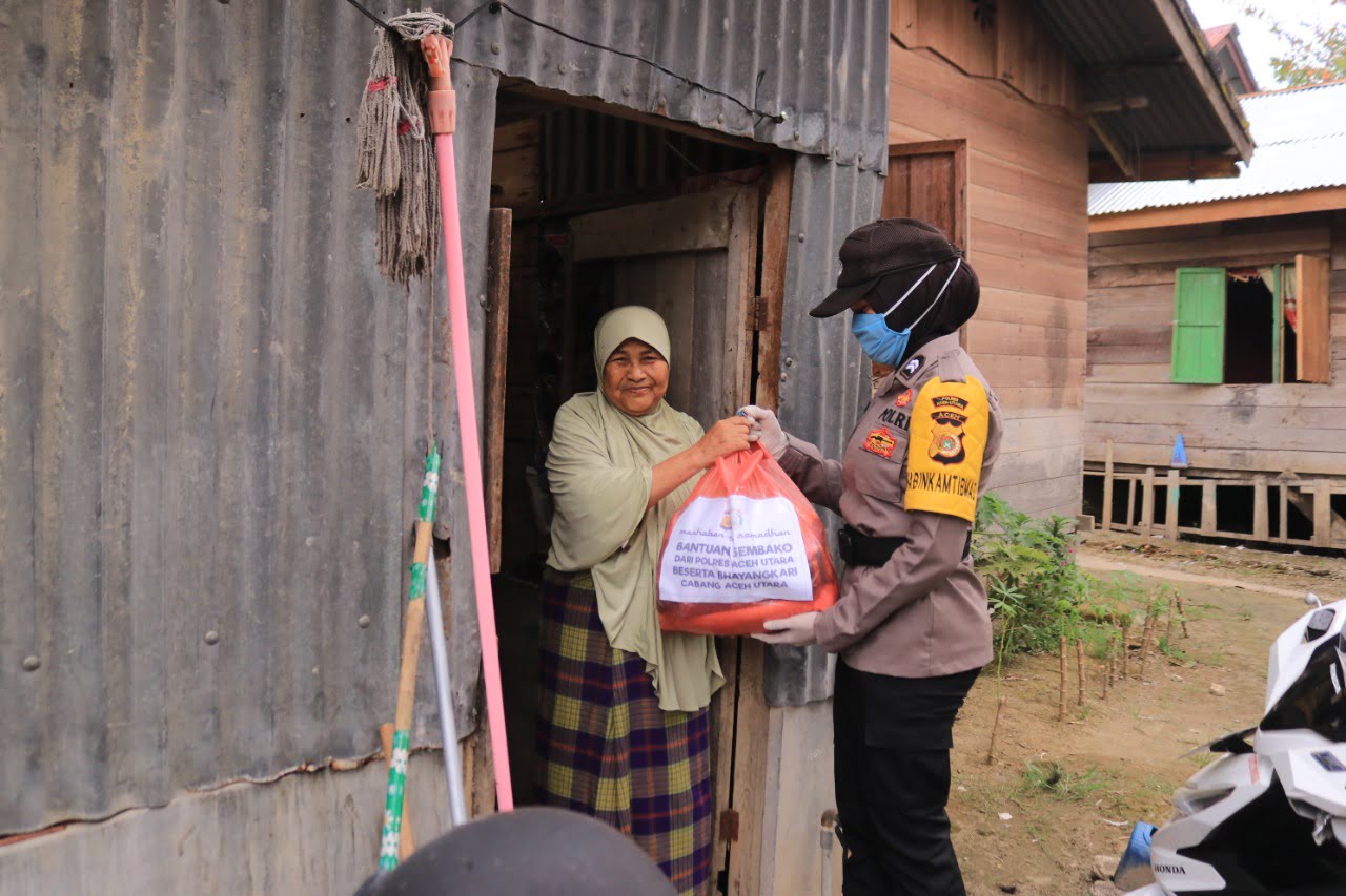 LHOKSUKON – Jajaran kepolisian Resor Aceh Utara secara serentak menyalurkan 300 paket sembako door to door kerumah warga kurang mampu. Selasa (21/4/2020).