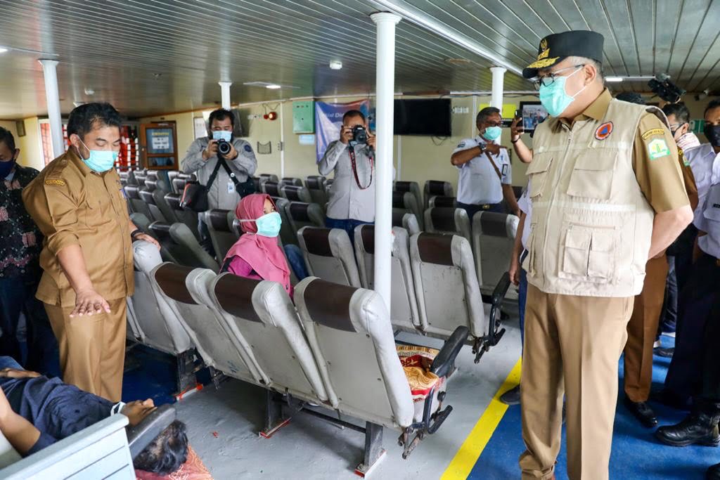 Banda Aceh – Pelaksana Tugas Gubernur Aceh, Nova Iriansyah, meninjau proses pengiriman logistik ke Sabang di Pelabuhan Penyeberangan Ulee Lheue, Banda Aceh, Selasa (12/5), siang.