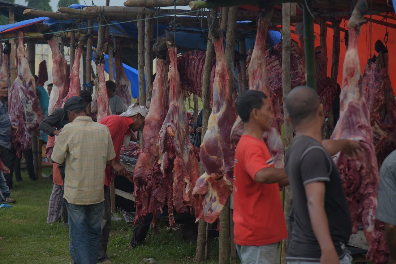 ACEH UTARA– Ratusan masyarakat berjubel di sejumlah pasar tradsional di Kabupaten Aceh Utara, Sabtu (23/5/2020). Mereka membeli daging sapi atau ayam sebagai tradisi meugang, sehari sebelum Idul Fitri di Aceh.