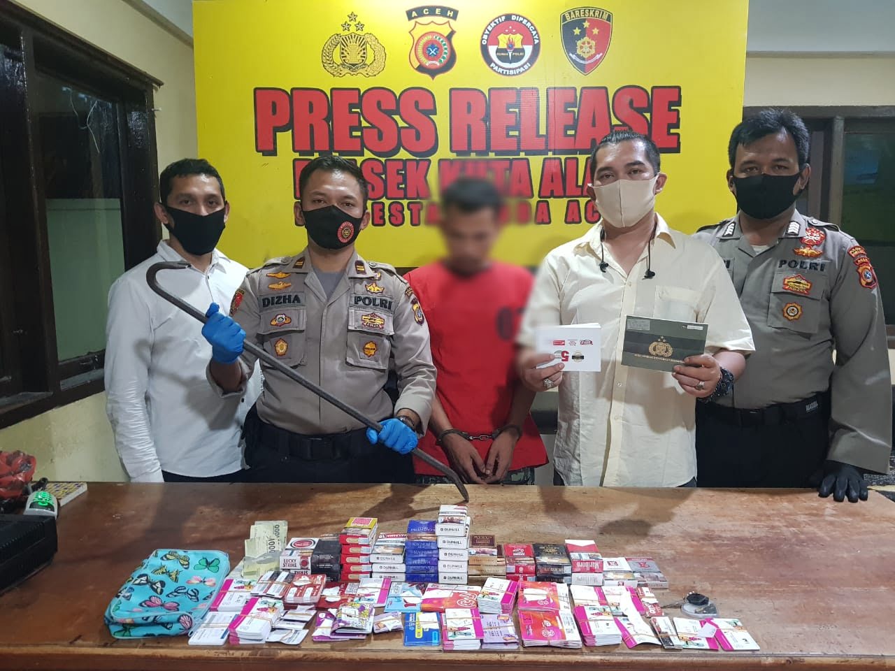 BANDA ACEH | Seorang residivis kasus narkoba berinisial PD (26) warga Gayo Lues menggasak ratusan voucher berbagai operator seluler di Wahyuna Cell Banda Aceh, Kamis (21/5/2020) dini hari.