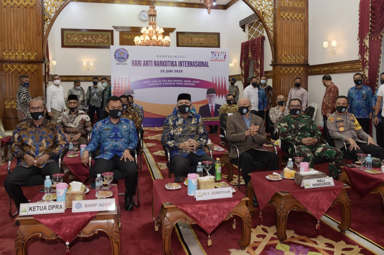 Banda Aceh – Pelaksana Tugas Gubernur Aceh Nova Iriansyah, bersama Forum Koordinasi Pimpinan Daerah Aceh, mengikuti peringatan Hari Anti Narkotika Internasional (HANI) tahun 2020 secara daring, di ruang tengah Meuligoe Gubernur Aceh, Jum’at (26/6/2020).