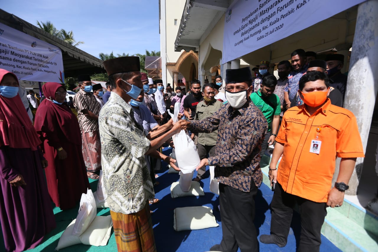 NAGAN RAYA – PT PLN (Persero) Unit Induk Wilayah (UIW) Aceh bekerjasama dengan Forum Pengurangan Risiko Bencana (Forum PRB) Aceh menyalurkan bantuan bahan pangan sebanyak 605 paket untuk guru ngaji, tenaga kesehatan bakti, dan kelompok masyarakat lainnya yang terimbas Covid-19.