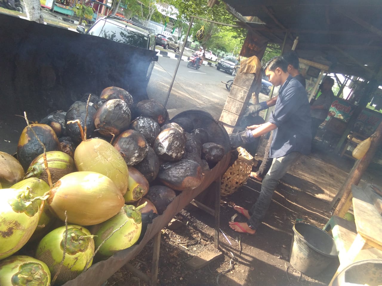 Sejumlah kendaraan roda dua dan empat parkir di jalanan aspal mulus itu. Lokasi ini persis didepan Gedung Juang Pelajar Islam Indonesia (PII) Provinsi Aceh. Di lokasi itu lah kelapa muda dibakar. Pekerja sibuk membolak-balik buah kelapa dalam tungku perapian yang telah disiapkan.