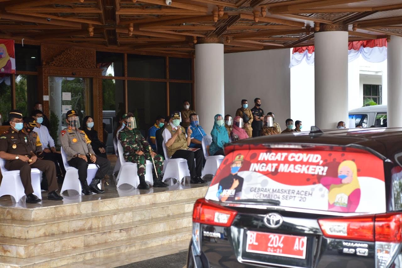Hadir dalam pelepasan itu Plt Gubernur, Pangdam Iskandar Muda, Kapolda Aceh dan Kajati Aceh. Juga hadir Sekda Aceh, Wakil Ketua PKK, Ketua DWP Aceh serta para Kepala SKPA dan Kepala Biro di lingkungan Setda Aceh yang berada di dalam mobil untuk memimpin langsung gebrak masker ke seluruh Aceh.