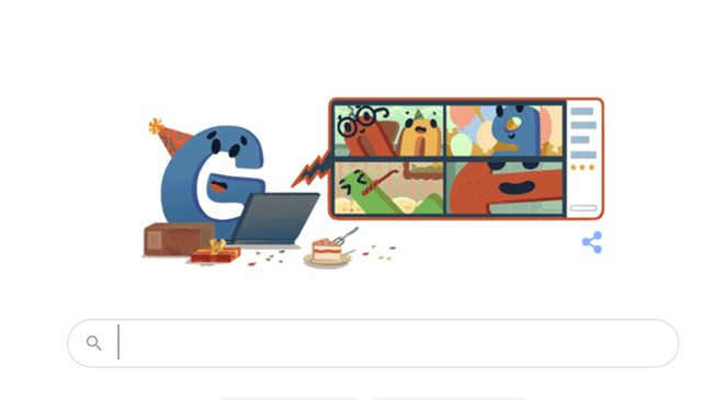 Di masa pandemi virus corona ini, Google merekomendasikan isyarat jaga jarak. Google doodle menggambarkan huruf ‘G’ yang mengenakan topi perayaan ulang tahun di depan laptop, yang menampilkan gambar rekan-rekannya yang turut merayakan ulang tahun google secara jarak jauh.