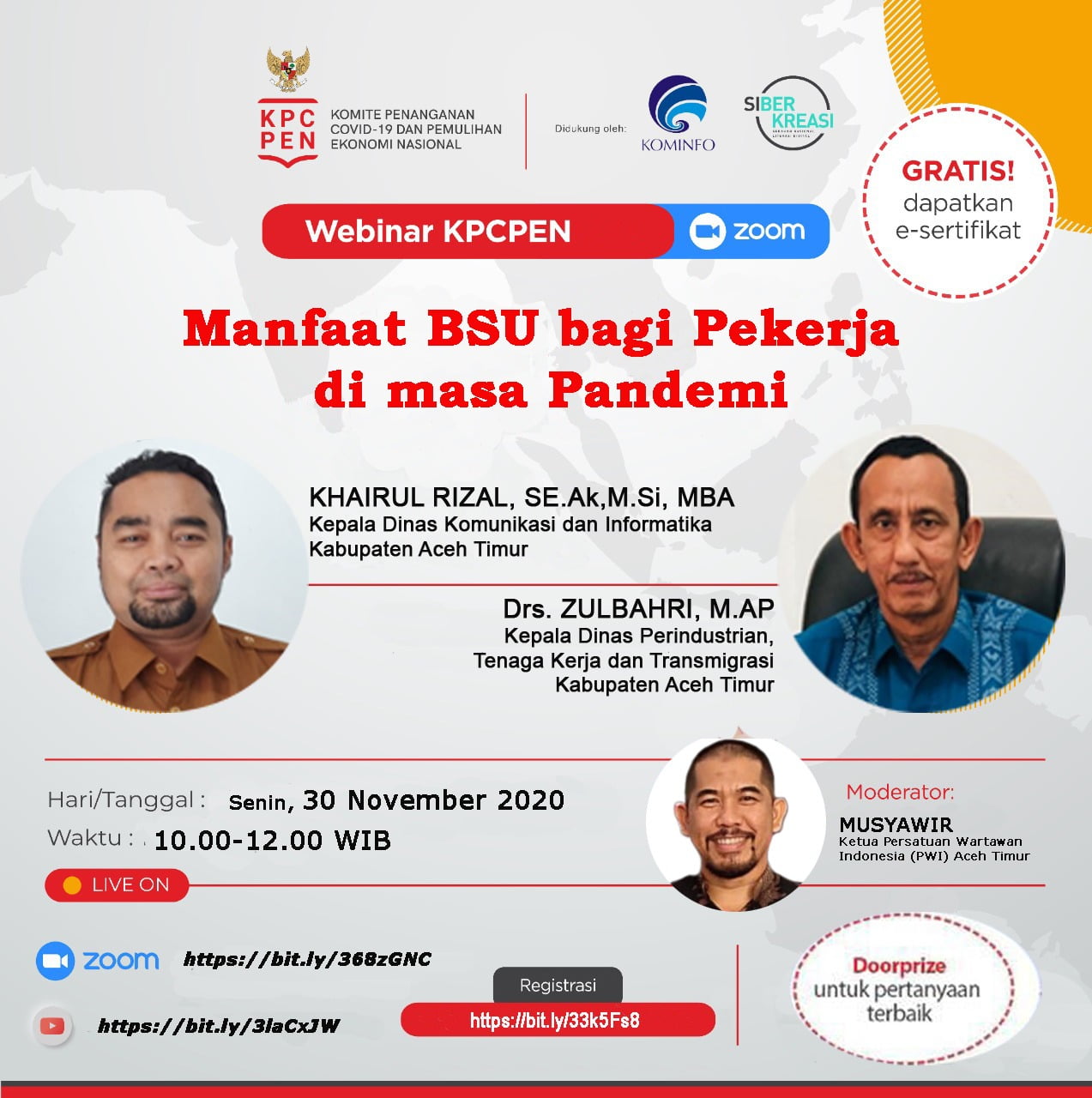 IDI – Komite Penanganan Covid dan Pemulihan Ekonomi Nasional (KPCPEN) bersama Diskominfo Aceh Timur menggelar Webinar tentang Bantuan Subsidi Upah (BSU), Senin 30 November 2020.