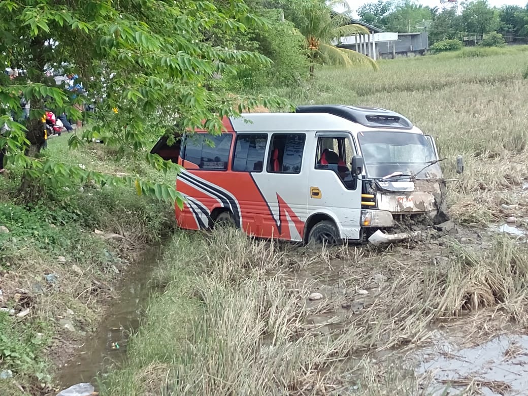 LHOKSUKON – Mobil penumpang umum jenis Isuzu Jumbo bernopol BL 7656 FL terperosok ke persawahan di jalan lintas Medan-B. Aceh tepatnya di Depan Warung Nasi Teupin Punti Gampong Pante Kecamatan Syamtalira Aron, Aceh Utara, Jumat (18/12/2020) pukul 14.20 WIB.