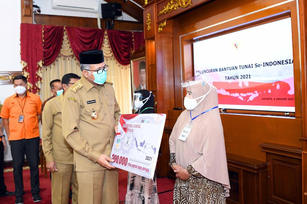Banda Aceh – Gubernur Aceh Nova Iriansyah, menyerahkan langsung tiga bantuan tunai serentak, Senin 4/1. Bantuan diserahkan secara seremonial kepada tiga penerima manfaat dari ketiga program yaitu Program Keluarga Harapan (PKH), Program Sembako dan Bantuan Sosial Tunai (BST).