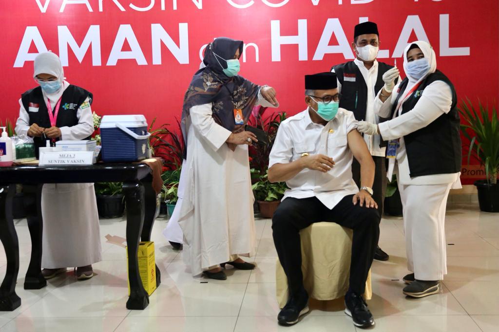 BANDA ACEH – Gubernur Aceh Nova Iriansyah, menerima suntikan dosis kedua vaksin covid-19 di Rumah Sakit Umum Daerah dr Zainoel Abidin (RSUDZA) Banda Aceh, Jumat (29/1/2021).