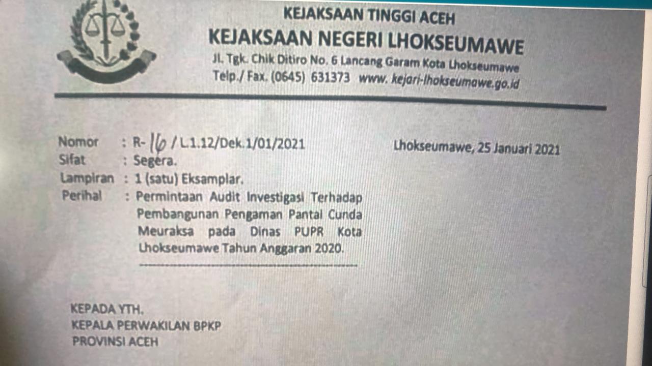 Kepala BPKP Aceh, Indra Khaira Jaya, dihubungi per telepon, Minggu (31/1/2021) menyebutkan, lembaganya sudah menerima surat dari Kejaksaan Negeri Lhokseumawe pada 28 Januari 2021 lalu untuk permintaan audit investigasi kasus itu. Surat itu tertanggal 25 Januari 2020.