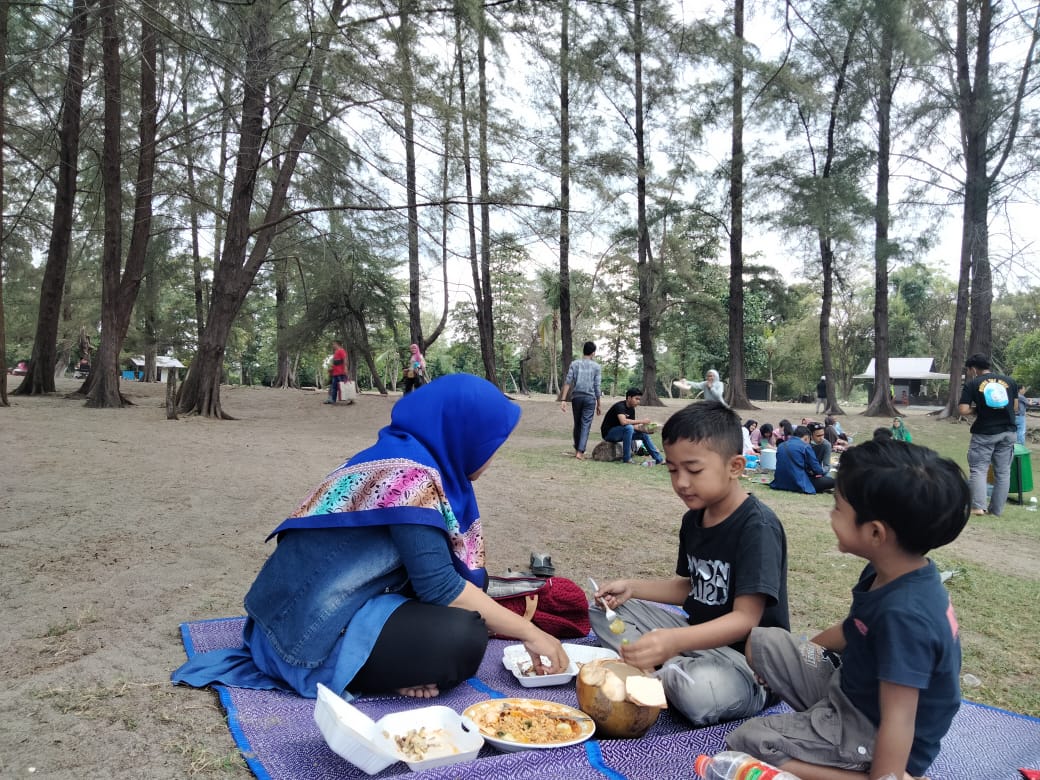 Pasalnya, tempat duduk yang disediakan pengelola terbatas. Maka, gelarlah tikar di bawah pohon pinus itu. Sembari meriung bersama keluarga, bakar-bakar ikan atau penganan lainnya.