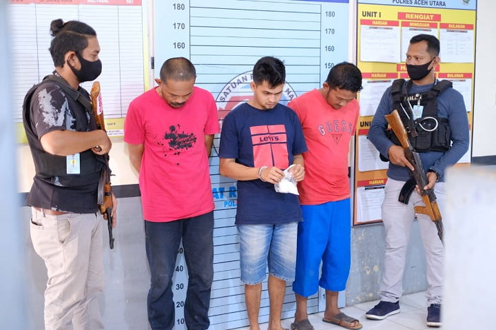 LHOKSUKON – Satres Narkoba Polres Aceh Utara menangkap tiga pelaku tindak pidana Narkoba dan mengamankan sebungkus sabu seberat 92,32 gram sebagai barang bukti. Salah satu tersangka merupakan buronan sejak 7 bulan lalu atas kepemilikan setengah kilo sabu.