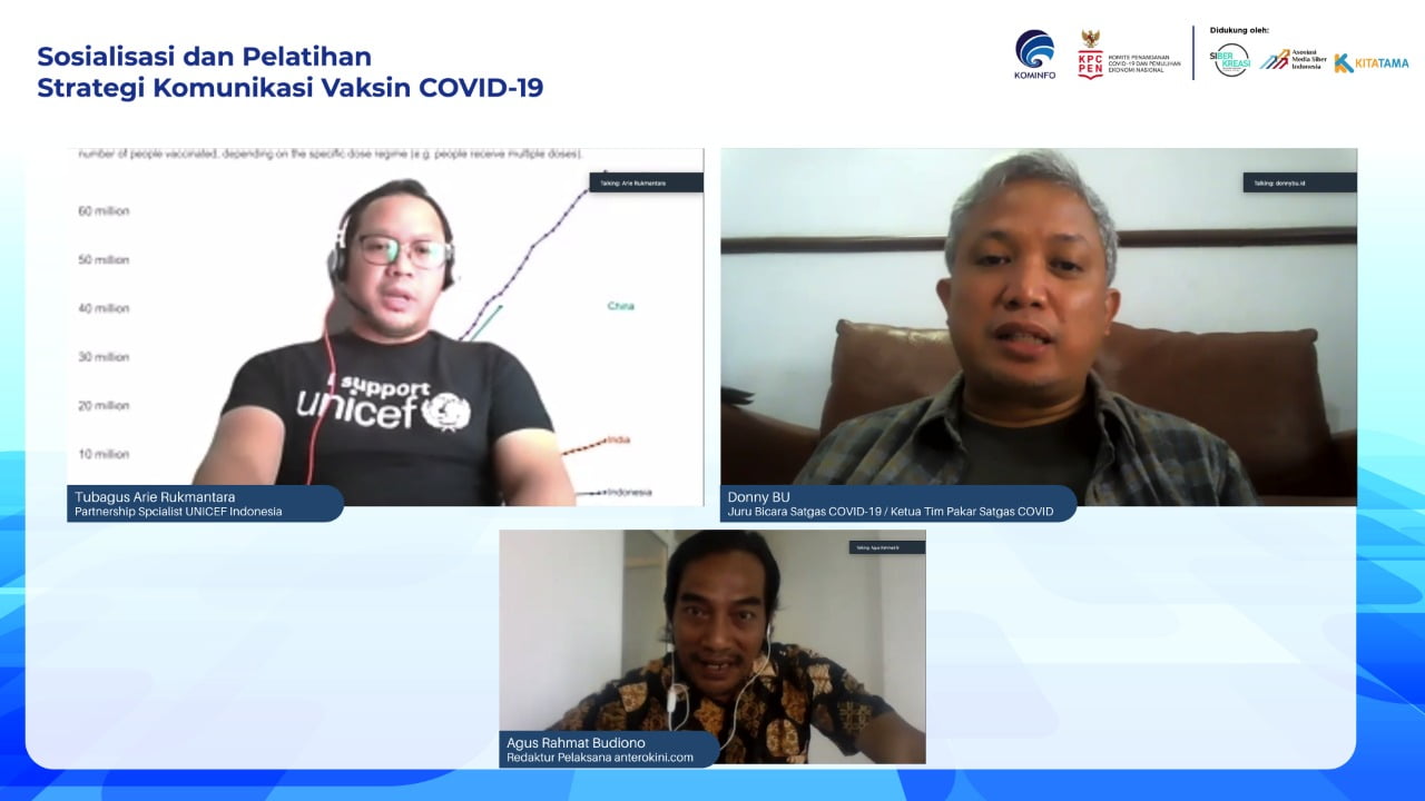 Diskusi dibuka oleh Tubagus Arie Rukmantara, Partnership Specialist Unicef Indonesia sebagai pembicara pertama dan dilanjutkan oleh Donny BU dari Tim Komunikasi Publik KPCPEN sebagai pembicara kedua adalah serta dimoderatori oleh Agus Rahmat Budiono, Redaktur Pelaksana anterokini.com. Para pembicara menyampaikan berbagai informasi guna meningkatkan pemahaman strategi komunikasi untuk vaksinasi COVID-19 khususnya di wilayah Aceh.