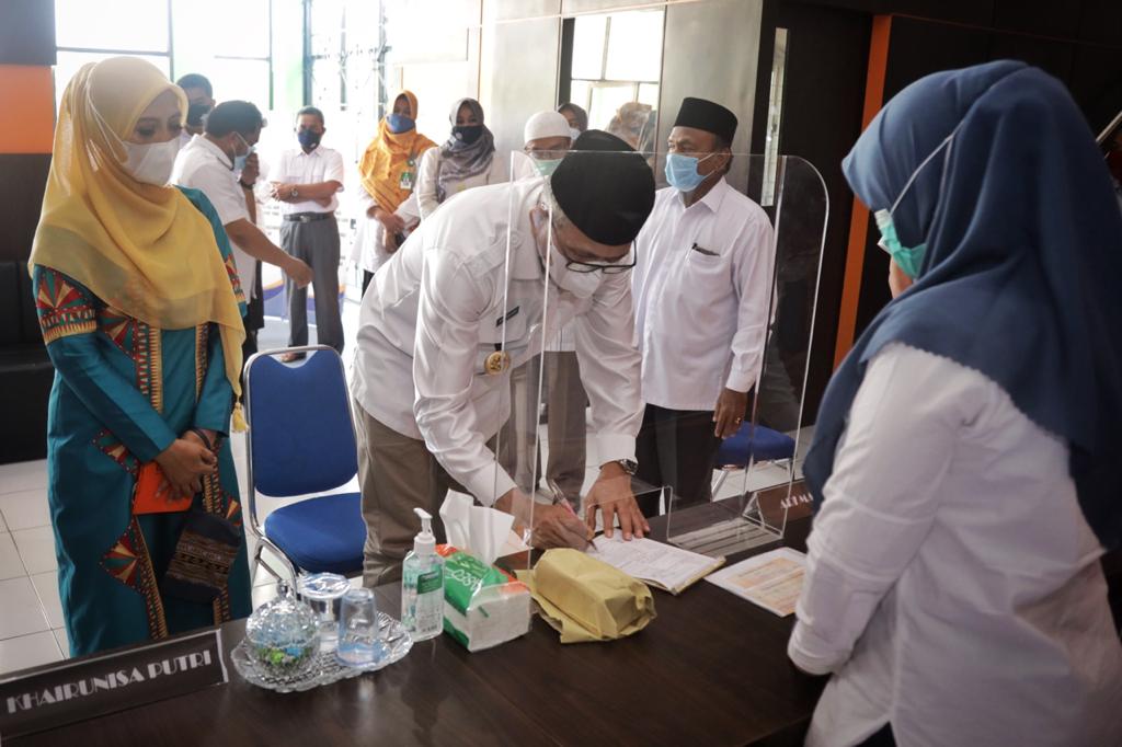 BANDA ACEH – Gubernur Aceh Nova Iriansyah bersama istri, Dyah Erti Idawati, menunaikan kewajiban membayar zakat di Baitul Mal Aceh, Rabu 10/3. Usai menerima zakat dari orang nomor satu Aceh itu, amil kemudian berdoa agar rezeki gubernur lancar dan berkah.