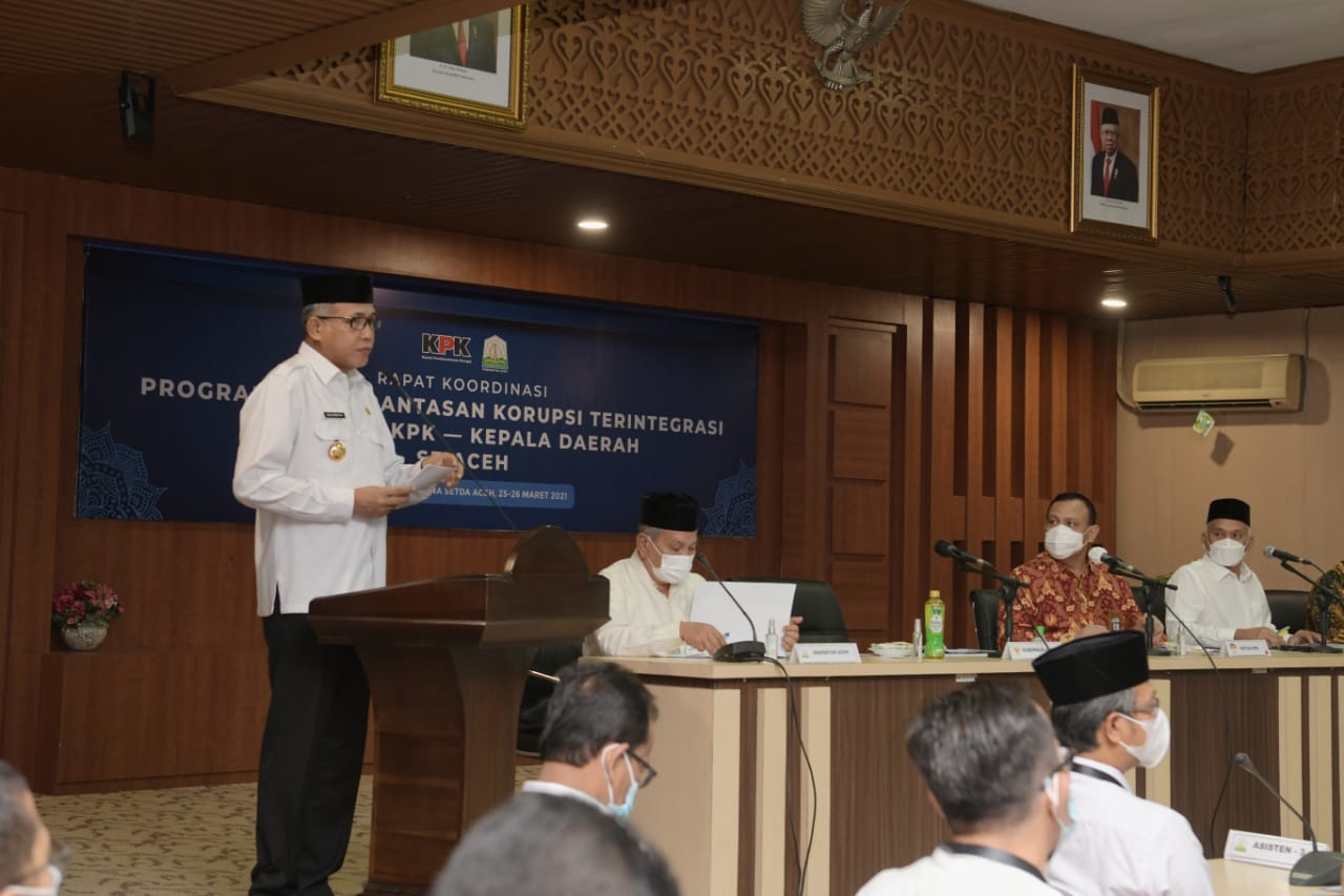 BANDA ACEH – Gubernur Aceh, Nova Iriansyah menyampaikan capaian Laporan Harta Kekayaan Penyelenggara Negara (LHKPN) pejabat Pemerintah Aceh kepada pimpinan Komisi Pemberantasan Korupsi (KPK). Capaian tersebut disampaikan dalam Rapat Koordinasi (Rakor) Program Pemberantasan Korupsi Terintegrasi antara KPK dengan Kepala Daerah se Aceh, di Gedung Serbaguna Sekretariat Daerah Aceh, Jumat, 26/03/2021.