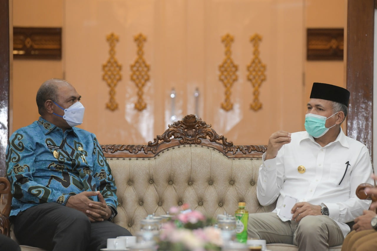 BANDA ACEH – Gubernur Aceh Nova Iriansyah, menerima kunjungan Wakil Gubernur Provinsi Papua Barat Mohammad Lakotani, di ruang tengah Meuligoe Gubernur Aceh, Selasa (30/3/2021).