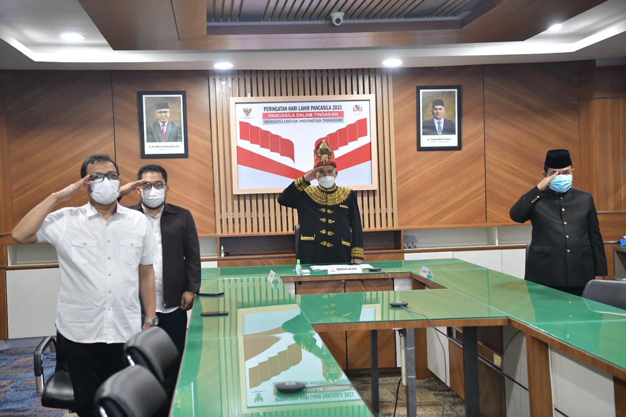 BANDA ACEH – Pemerintah Aceh mengikuti pelaksanaan peringatan Hari Lahir Pancasila, Selasa 1 Juni 2021. Sekda Aceh, dr. Taqwallah M.Kes, bersama sejumlah pejabat SKPA mengikuti kegiatan yang dilangsungkan dari Gedung Pancasila di Jakarta itu secara virtual.