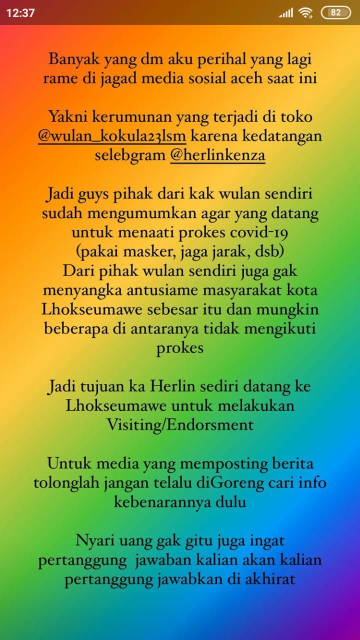 Selebram ini memposting video dirinya datang ke Lhokseumawe lewat @herlinkenza. Dalam video itu terlihat dia menaiki mobil Alpard warna putih dan dikawal aparat keamanan berpakaian dinas. Setiba di toko grosir itu dia turun bak artis dengan berjalan di atas karpet.