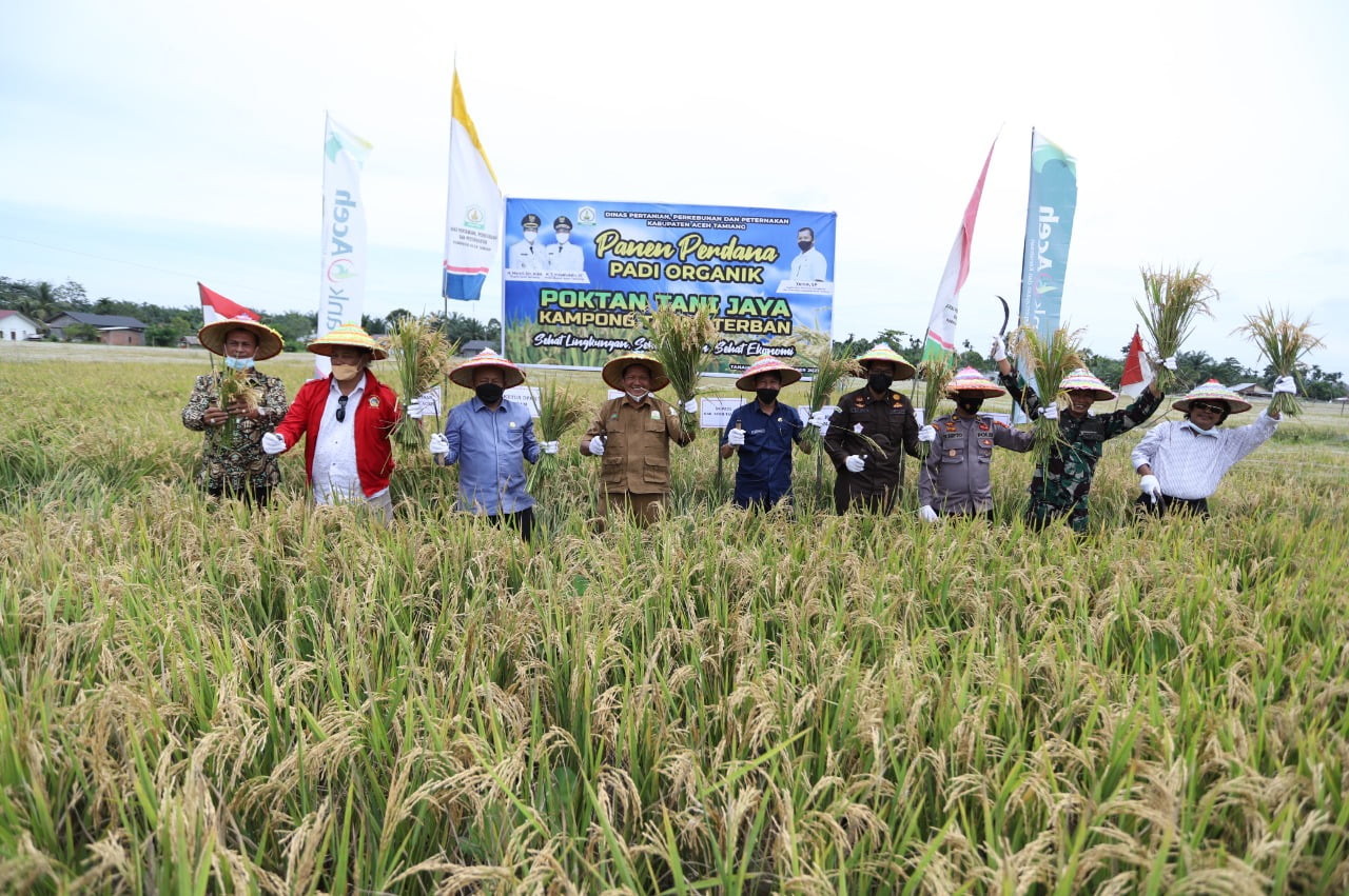 PAGI itu sebuah tenda berdiri di areal pertanian. Sejumlah mobil berderet rapi. Mobil aneka merk dan mewah. Pemandangan itu jarang terlihat. Kali itu, sejumlah pertani yang tergabung dalam Kelompok Tani Jaya, Desa Tanah Terban, Kecamatan Karang Baru, Kabupaten Aceh Tamiang, mengembangkan tanaman padi organik empat bulan terakhir. Kemarin, Selasa (5/10/2021) Bupati Aceh TAmiang, Mursil, hadir ke lokasi untuk panen padi pertama.