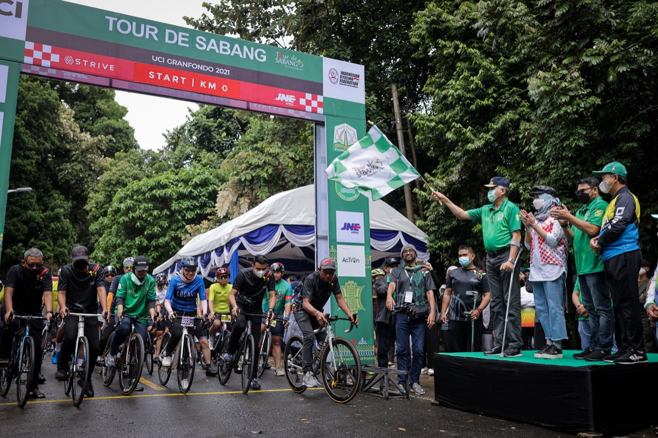 SABANG – Gubernur Aceh Nova Iriansyah membuka kegiatan “Tour de Sabang 2021” di titik Nol Kilometer Indonesia, Minggu (28/11/2021). Pembukaan ditandai dengan penglepasan para atlet balap sepeda di garis start titik Nol Kilometer Indonesia menuju garis finish di area Sabang Fair.