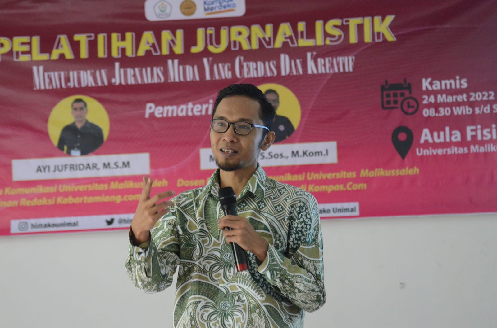 Pelatihan yang mengungsung tema “Mewujudkan jurnalis muda yang cerdas dan kreatif” tersebut berlangsung di Aula FISIP Kampus Bukit Indah, Lhokseumawe. Kegiatan itu menghadirkan pemateri yang ahli di bagian jurnalistik yaitu Ayi Jufridar yang merupakan Dosen Prodi Ilmu Komunikasi Unimal, juga Ahli Pers di Dewan Pers, dan Pimpinan Redaksi Kabartamiang.co. Kemudian, Masriadi Sambo yang merupakan Dosen Prodi Ilmu Komunikasi Unimal dan juga wartawan di Kompas.com. Juga dihadiri oleh sejumlah mahasiswa dari berbagai prodi yang ada di Unimal.