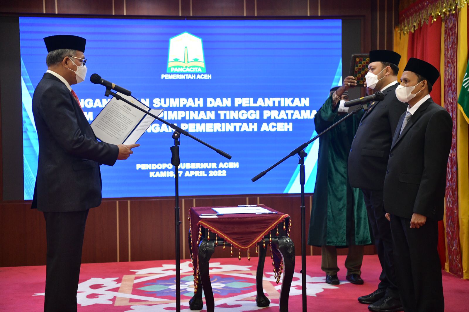 BANDA ACEH-Gubernur Aceh, Nova Iriansyah, melantik dan mengambil sumpah dua pejabat pimpinan tinggi pratama di lingkungan Pemerintah Aceh. Pelantikan tersebut berlangsung di Meuligoe Gubernur Aceh, Kamis, (7/4/2022).