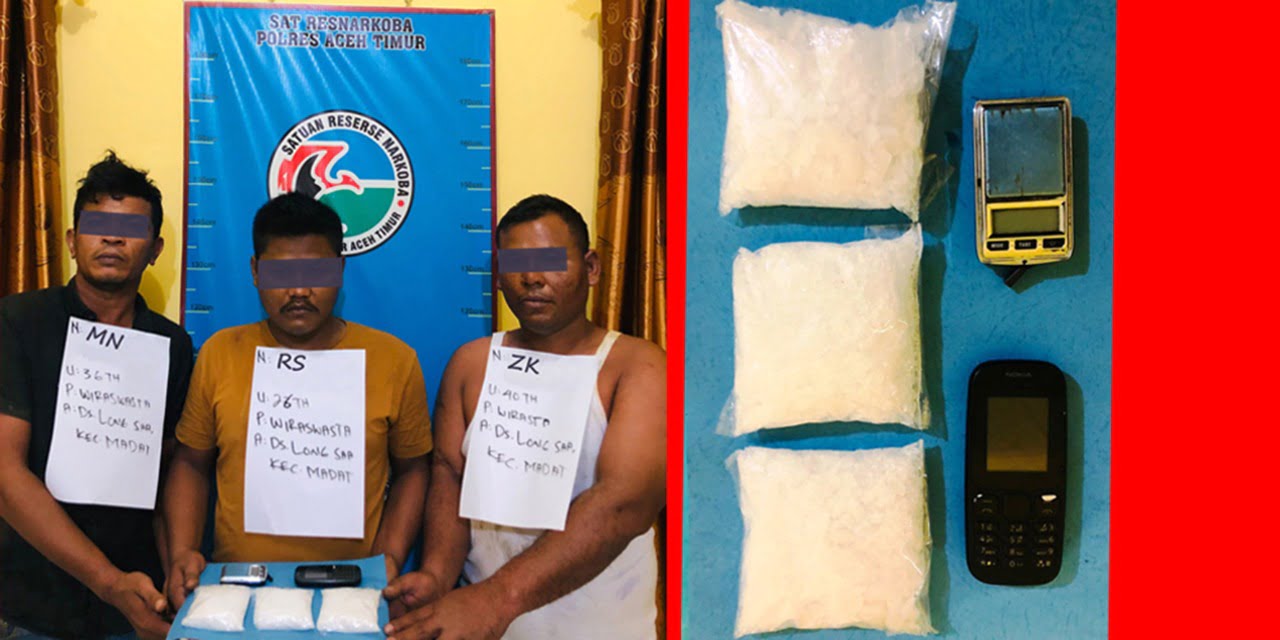 Kemudian pada hari Kamis, (07/04/2022) pada pukul 19.30 WIB dari sebuah rumah di Desa Long Sa, Kecamatan Madat, Tim Opsnal Satres Narkoba Polres Aceh Timur mengamankan RS (26), MN (36), dan ZK (40) ketiganya warga setempat, karena berdasarkan informasi mereka akan melakukan transaksi narkotika jenis shabu, kemudian dilakukan penggeledahan terhadap badan ketiganya dan melakukan penyisiran di seputaran rumah milik pelaku MN tersebut.