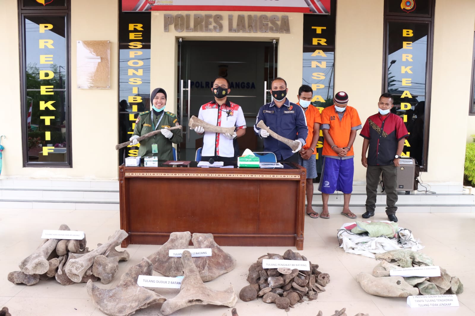 “Informasi itu lalu kita telusuri, kita temukan lima karung goni berisi tulang belulang gajah pada dua tersangka ini,” sebut Iptu Imam.