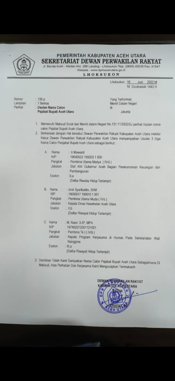 ACEH UTARA – DPRD Kabupaten Aceh Utara, Provinsi Aceh mengirimkan usulan tiga nama calon Penjabat Bupati Aceh Utara. Wartawan Bakata.net, menerima salinan surat tertanggal 18 Juni 2022 dan ditandatangani Ketua DPRD Aceh Utara, Arafat.