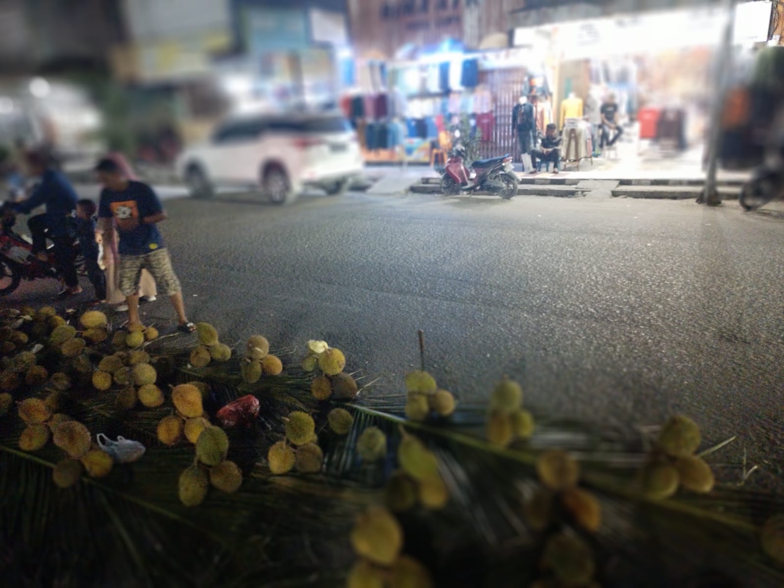 Mereka mulai menjual durian di pinggir jalan itu sejak pukul 16.00 WIB hingga dinihari. Tidak ada lokasi khusus. Mereka menggelar dagangan di pinggir jalan, di depan toko yang masih buka hingga malam hari.