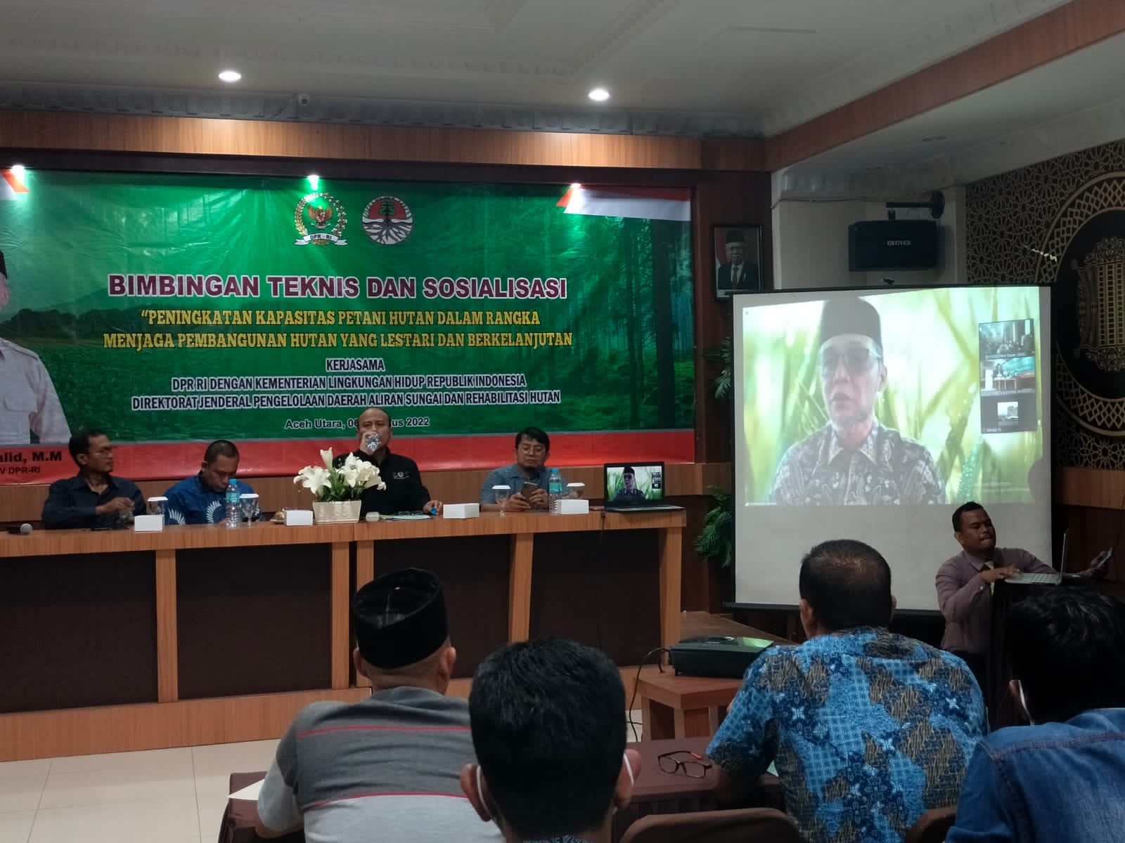 Acara ini turut dihadiri oleh Kepala Balai Pengelolaan Daerah Aliran Sungai (BPDAS) Krueng Aceh Eko Nurwijayanto, Kadis Lingkungan Hidup dan Kebersihan Aceh Utara Teuku Cut Ibrahim, SE, M. Si, Pemateri serta sejumlah perwakilan petani hutan Aceh Utara.
