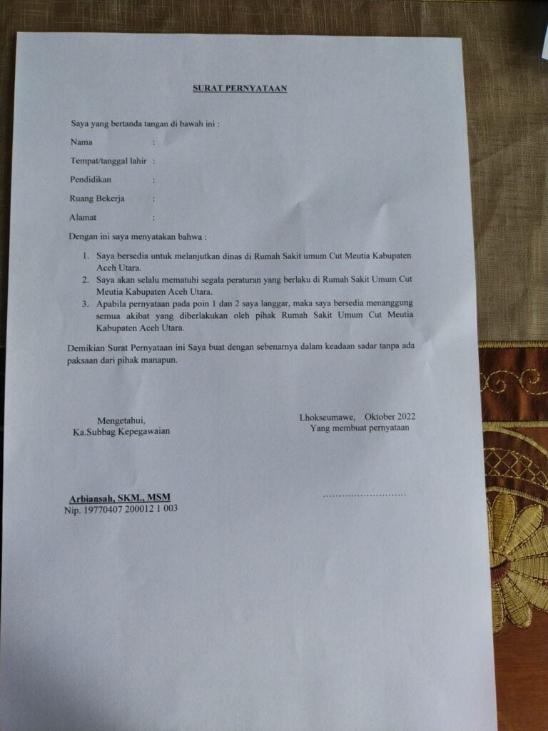 Surat itu dibuat oleh Kepala Sub Bagian Kepegawaian RSUCM Aceh Utara, Arbiansyah. Surat ini diberiwaktu untuk ditandatangani oleh para demonstran paling lambat pukul 16.00 WIB, Selasa (11/11/2022).