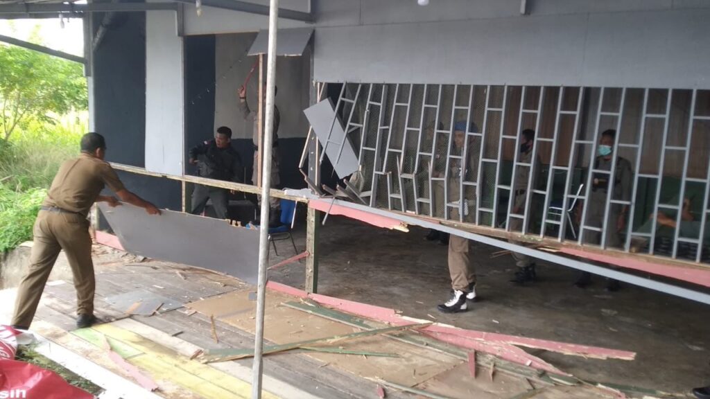 LHOKSEUMAWE- Tim Gabungan penertiban Pemko Lhokseumawe terdiri dari Satpol PP dan Wilayatul Hisbah (WH) Kota Lhokseumawe dibantu personel dari TNI dan Polri, membongkar secara paksa tiga bangunan kafe di Waduk Pusong, Kecamatan Banda Sakti, Kota Lhokseumawe.
