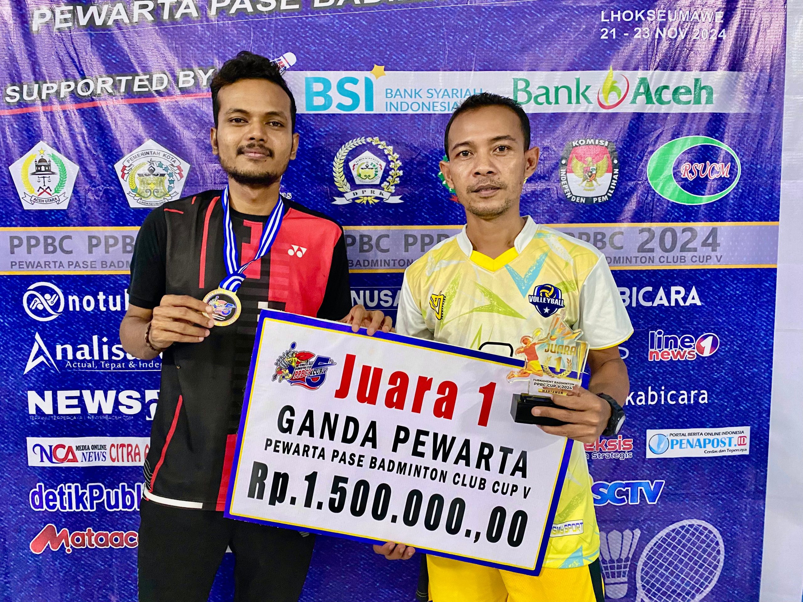 LHOKSEUMAWE – Muzakir dan Ramadhan berhasil meraih juara pertama pada turnamen bulu tangkis kategori ganda tingkat wartawan yang diselenggarakan oleh Pewarta Pasee Badminton Club (PPBC) di gedung SKB Aceh Utara. Sedangkan juara kedua diraih oleh Jufri bersama Romo.