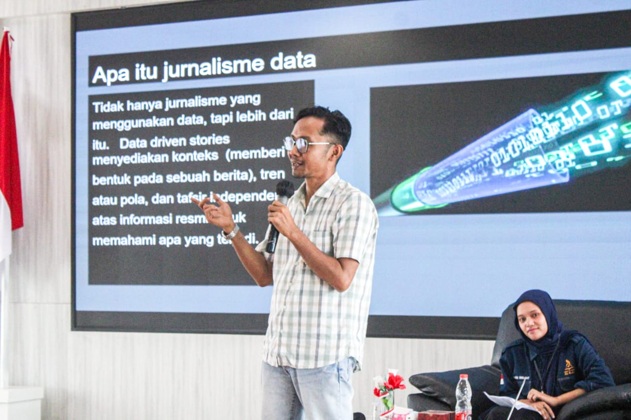 Kegiatan yang mengusung tema berkarya dengan data, menggali fakta dengan rasa itu menghadirkan pembicara dosen Ilmu Komunikasi Universitas Malikussaleh (Unimal), yaitu Masriadi Sambo, S.Sos., M.Kom.l.
