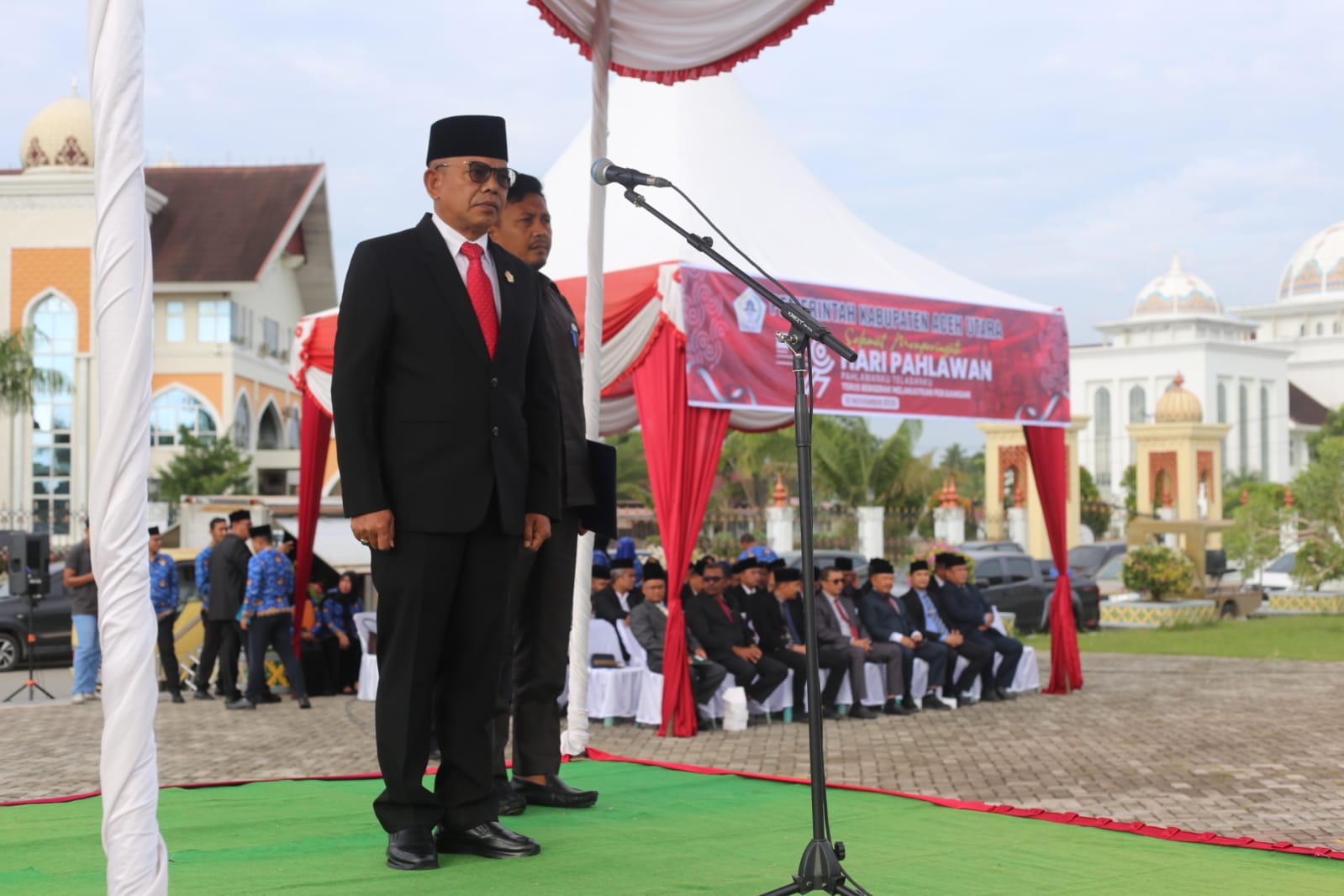 ACEH UTARA | Sekretaris Daerah Kabupaten Aceh Utara Dr A Murtala, MSi, bertindak sebagai inspektur upacara memperingati Hari Pahlawan Nasional Tahun 2025 yang digelar di lapangan upacara Landing, depan Kantor Bupati setempat, Senin, 10 November 2025.