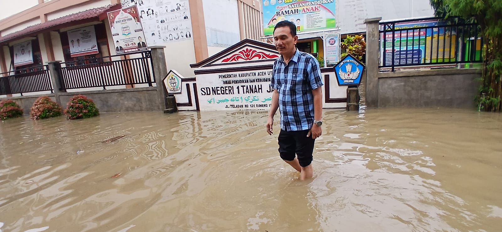 “Jalan menuju sekolah dan halaman sekolah seluruhnya terendam banjir. Jadi, kami pastikan proses belajar mengajar terhenti sementara untuk keamanan peserta didik,’ kata Jamaluddin.