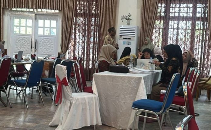 LHOKSUKON – Sejumlah pegawai negeri sipil (PNS) duduk di depan laptop di hall utama Pendopo Bupati Kabupaten Aceh Utara, Provinsi Aceh, di Kota Lhokseumawe, Selasa (21/4/2026).