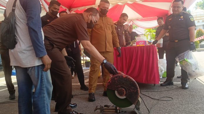 ACEH UTARA- Kejaksaan Negeri (Kejari) Aceh Utara memusnahkan barang bukti 77 perkara tindak pidana umum dan lainnya yang telah berkekuatan hukum tetap atau inkrah di depan halaman kantor Kejaksaan setempat, Selasa (28/4/2026). Hadir Bupati Aceh Utara Ismail A Jalil akrab disapa Ayahwa.