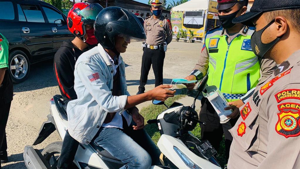 LHOKSEUMAWE - Polres Lhokseumawe melaksanakan pembagian masker dan sosialisasi kepada pengguna jalan lintas Medan – Banda Aceh di depan Stasiun…